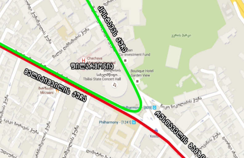 მოძრაობა აიკრძალება თბილისის საკონცერტო დარბაზის (ფილარმონიის) მიმდებარე ტერიტორიაზე, რუსთაველის გამზირის მიმართულებით.