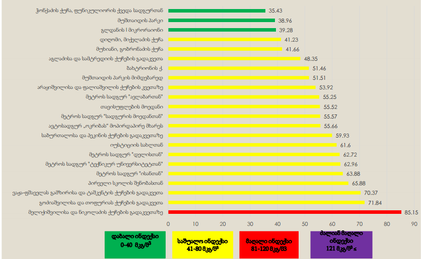 სააგენტოს ინფორმაციით, დაბინძურების საშუალო მაჩვენებელი ფიქსირდება დიღომში, მიქელაძის ქუჩაზე, მუხიანში, გობრონაძის ქუჩაზე, აგლაძისა და სამტრედიის ქუჩების გადაკვეთაზე, ბახტრიონის ქუჩაზე, მუშთაიდის პარკის მიმდებარედ, არაყიშვილისა და ფალიაშვილის ქუჩების კვეთაზე, ასევე, მეტროს სადგურებთან: “ავლაბარი”, “თავისუფლების მოედანი” და “სადგურის მოედანი”.