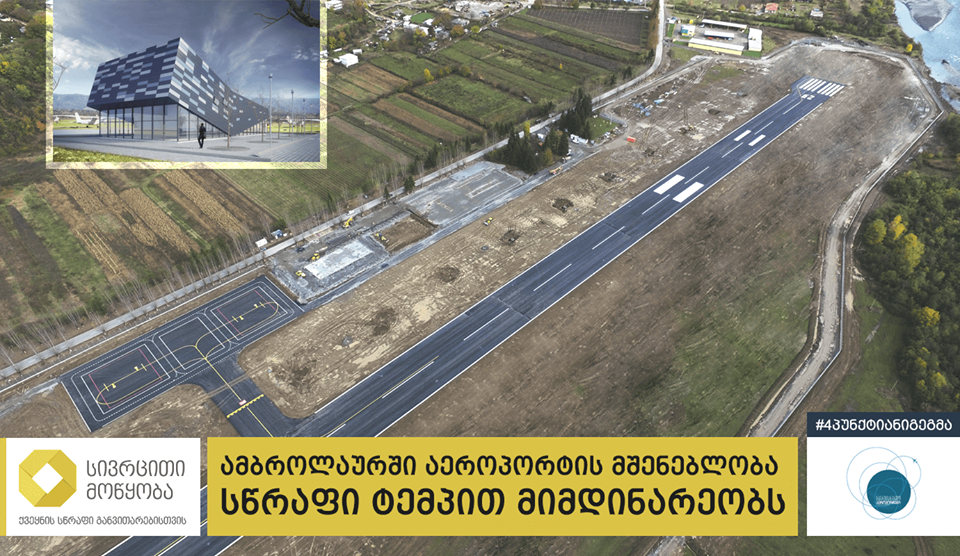 ამბროლაურში აეროპორტის მშენებლობა სწრაფი ტემპით მიმდინარეობს, ასაფრენ-დასაფრენ ზოლზე, სამანევრო ზოლზე და თვითმფრინავების სადგომზე სამუშაოები უკვე დასრულებულია, მიმდინარეობს საპატრულო გზის პროფილში გასწორება, სადრენაჟე კოლექტორების რკინა ბეტონის ჭების მოწყობა, შემოღობვის სამუშაოები, ასევე დაგეგმილია მდ.რიონზე ნაპირდამცავი კონსტრუქციის მშენებლობა, რაც ტერმინალის მშენებლობის პარალელურად მოხდება