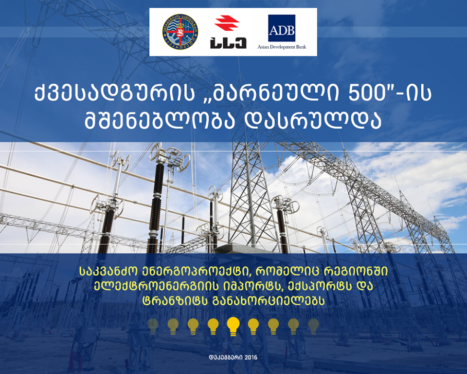 ქვესადგურის "მარნეული 500" მშენებლობა დასრულდა „რეგიონალური ელექტროგადაცემის გაუმჯობესების პროექტი“, რომელიც "აზიის განვითარების ბანკის" (ADB) ფინანსური მხარდაჭერით განხორციელდა და მისმა ღირებულებამ 50 მლნ აშშ დოლარი შეადგინა.