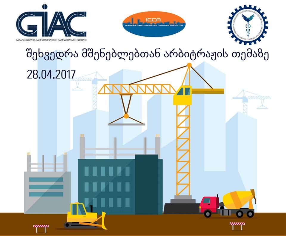 28 მაისს, 11 საათზე, სასტუმრო „რედისონ ბლუ ივერია“-ში საქართველოს საერთაშორისო საარბიტრაჟო ცენტრი (GIAC) კერძო დავების გადაწყვეტის მექანიზმის შესახებ ინფორმაციას მშენებლებს წარუდგენს. საქართველოს სავაჭრო-სამრეწველო პალატასთან არსებული ცენტრის ხელმძღვანელი ინსფრასტრუქტურის მშენებელთა ასოციაციის წევრ კომპანიებს შეხვდება. შეხვედრა მიზნად ისახავს არბიტრაჟის ინსტიტუტის შესახებ ცნობადობის ამაღლებას და მისი გამოყენებით დავების გადაწყვეტის უპირატესობების წარმოჩენას სასამართლოსთან შედარებით.