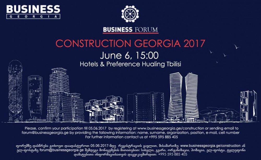 6 ივნისს, სასტუმრო Hotels & Preference Hualing Tbilis-ში BUSINESS GEORGIA-ს ორგანიზებით და THOUSE.GE ის პარტნიორობით ბიზნეს ფორუმი Construction Georgia 2017 გაიმართება. თემის ფარგლებში განიხილება სამშენებლო ბიზნესი, როგორც ერთ-ერთი ყველაზე მზარდი სექტორი საქართველოში. ღონისძიების მთავარი მიზანია განისაზღვროს ისეთი ეკონომიკური ფაქტორები, როგორიც არის სამშენებლო სექტორის როლი ქვეყნის ეკონომიკურ ზრდაში და სტანდარტიზაცის მნიშვნელოვანი გავლენები სამშენებლო სექტორზე.