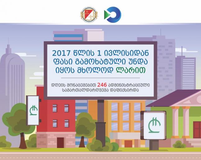 საქართველოს ტერიტორიაზე სატელევიზიო, ონლაინ და საჯარო სივრცეში ქონების რეალიზაციის ან/და მომსახურების გაწევის შეთავაზების ან/და რეკლამირებისას ფასის ლარით დადების წესის დარღვევაზე, ადმინისტრირებას ფინანსთა სამინისტროს შემოსვლების სამსახური ახორციელებს",- ნათქვამია შემოსავლების სამსახურის ინფორმაციაში.