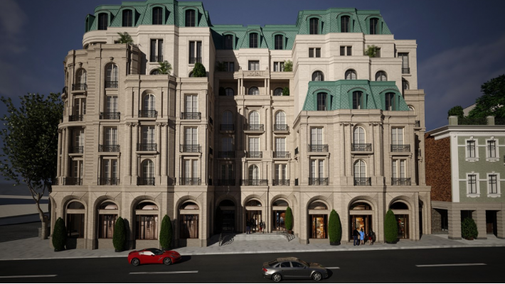 დოკუმენტის მიხედვით ირკვევა, რომ ფასადი მოპირკეთებული იქნება ქვიშისფერი ტრავერტინის ფილებით (მეოთხე და მომრგვალებულ ნაწილში მეხუთე სართულამდე) მეხუთე, მეექვსე სართული მოპირკეთდება ტრავერტინის კრემისფერი ფილებით, მერვე სართულის ფასადი მოპირკეთდება მწვანე (გადახურვის მასალასთან შესაბამისი) პანელებით. გადახურვა მოხდება მწვანე ფერის თუნუქის სახურავით.კომერციულ სართულზე ვიტრაჟები მუქი ხის ფერია, მეორედან მეოთხე სართულამდე და მომრგვალებული ნაწილში მეხუთე სართულზე ფანჯრის ღიობებში განთავსდება ორ ფრთიანი (კრემისფერი) ვიტრაჟები, დანარჩენი სართულის ვიტრაჟები შავი ალუმინის იქნება.