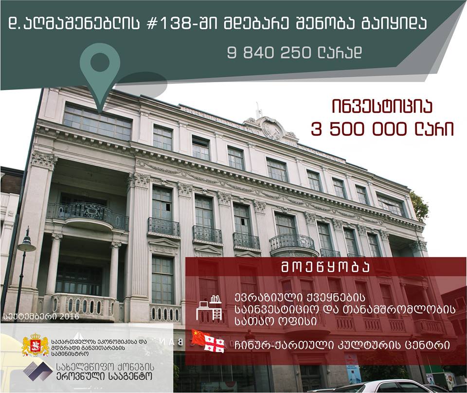შპს „სი ი ეფ სი“ ევრაზიული ქვეყნების საინვესტიციო და თანამშრომლობის სათაო ოფისის მოწყობას გეგმავს. ასევე, შეიქმნება ჩინურ-ქართული კულტურის ცენტრი. ამასთან, კომპანია უზრუნველყოფს შენობის ისტორიული და კულტურული იერსახის შენარჩუნებას.